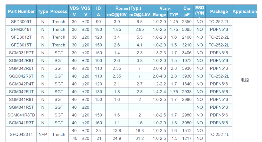 SGM041R8T是SGT MOSFET的一个典型代表,其漏源击穿电压为40V,漏极电流最大可达150A。该器件的开启延迟典型值为7nS,关断延迟时间典型值为4nS,上升时间和下降时间分别为9nS和6nS。其输入电容为2980pF,输出电容为893pF,反向传输电容为38pF,反向恢复时间为7nS,正向电压的最大值为2V。此外,其Rds(on)典型值为6mΩ,使得它在电动工具、园林工具、逆变器、储能以及家电类产品等多个领域得到广泛应用。