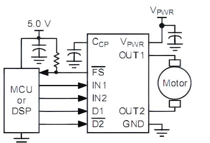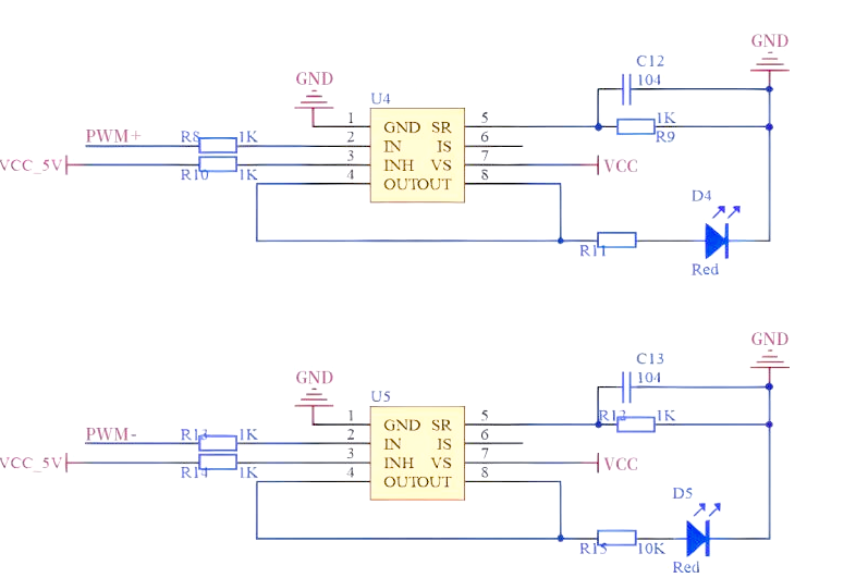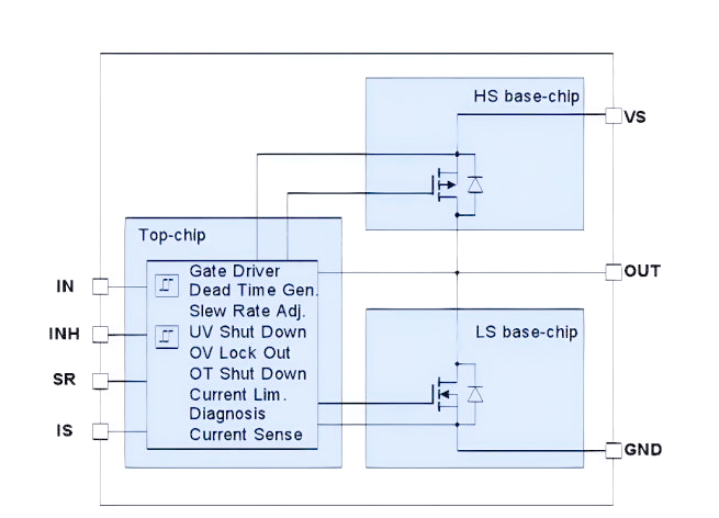 芯片内部结构包含两个MOS管,它们分别在上边和下边。当IN输入高电平时,上边的MOS管会导通,被称为高边MOS管;而当IN输入低电平时,下边的MOS管则导通,被称为低边MOS管。此外,INH信号的控制也至关重要:当INH为高电平时,芯片将进入工作状态;而当INH为低电平时,芯片则处于不工作状态。接下来,我们将通过典型电路图来深入理解这一工作原理。