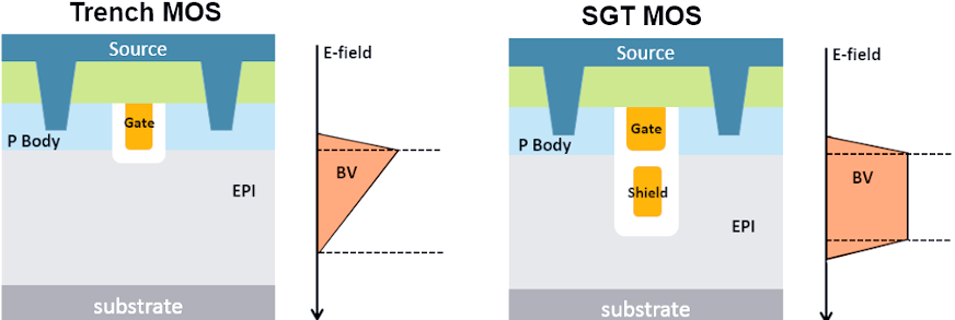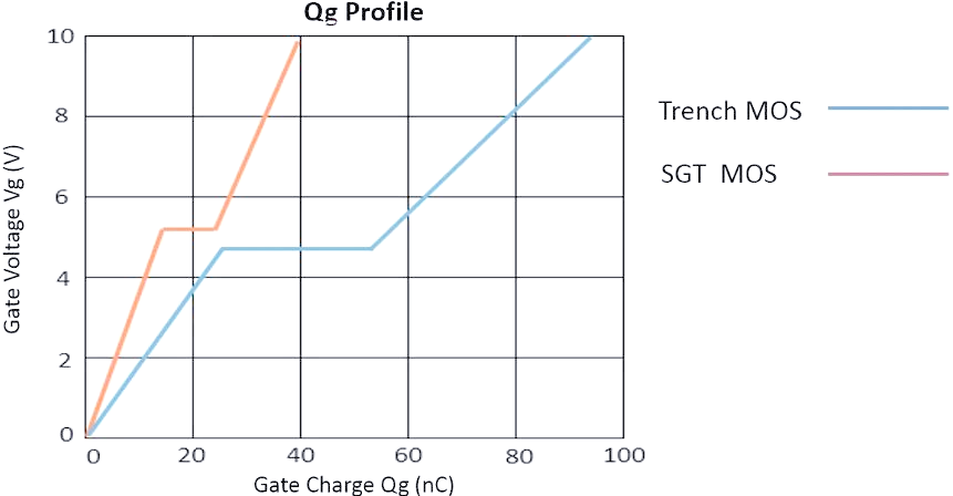图2展示了Trench MOS与SGT MOS在栅电荷方面的对比。SGT工艺的创新之处在于其能够显著降低Qg,这一技术突破不仅改变了MOSFET内部电场的分布,还将传统的三角形电场重塑为梯形电场。这样的改进使得EPI层的厚度得以进一步缩减,进而降低了导通电阻Rds(on)。这一系列优化措施共同作用,有助于在开关电源应用中显著减少器件的开关损耗。